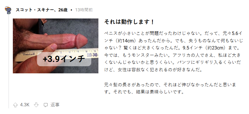 彼はポンプやウエイトを使わずにペニスを4.4インチ成長させました。